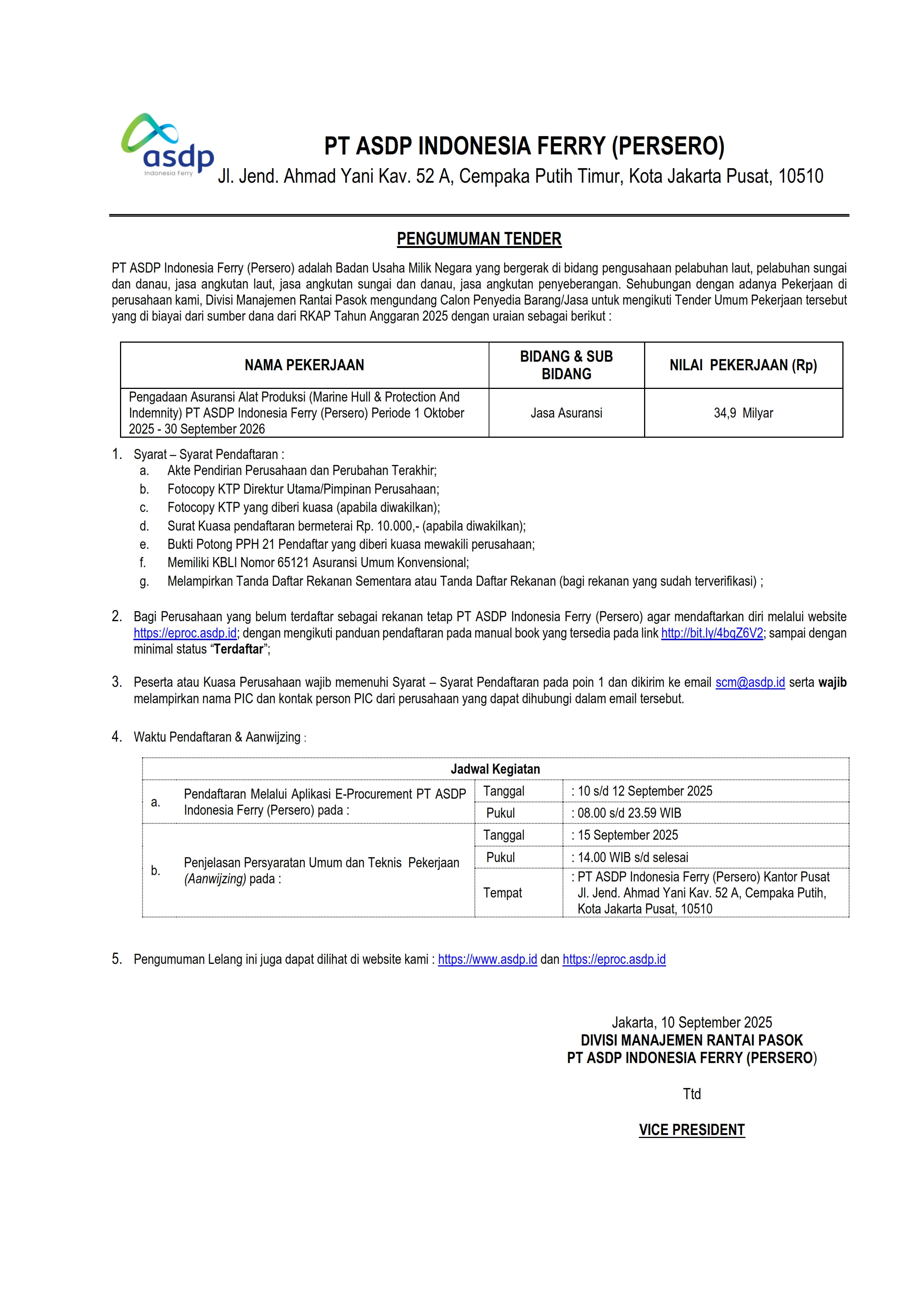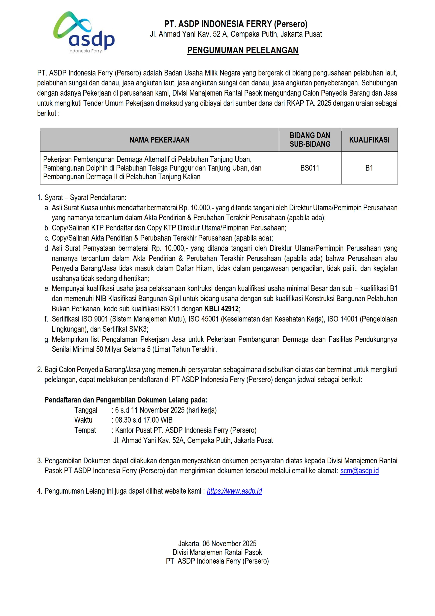 25 Februari 2026PT. ASDP Indonesia Ferry (Persero) adalah Badan Usaha Milik Negara yang bergerak di bidang pengusahaan pelabuhan laut, pelabuhan sungai dan danau, jasa angkutan laut, jasa angkutan sungai dan danau, jasa angkutan penyeberangan.Sehubungan dengan adanya pekerjaan Paketisasi Rehabilitasi Dermaga I Pela...