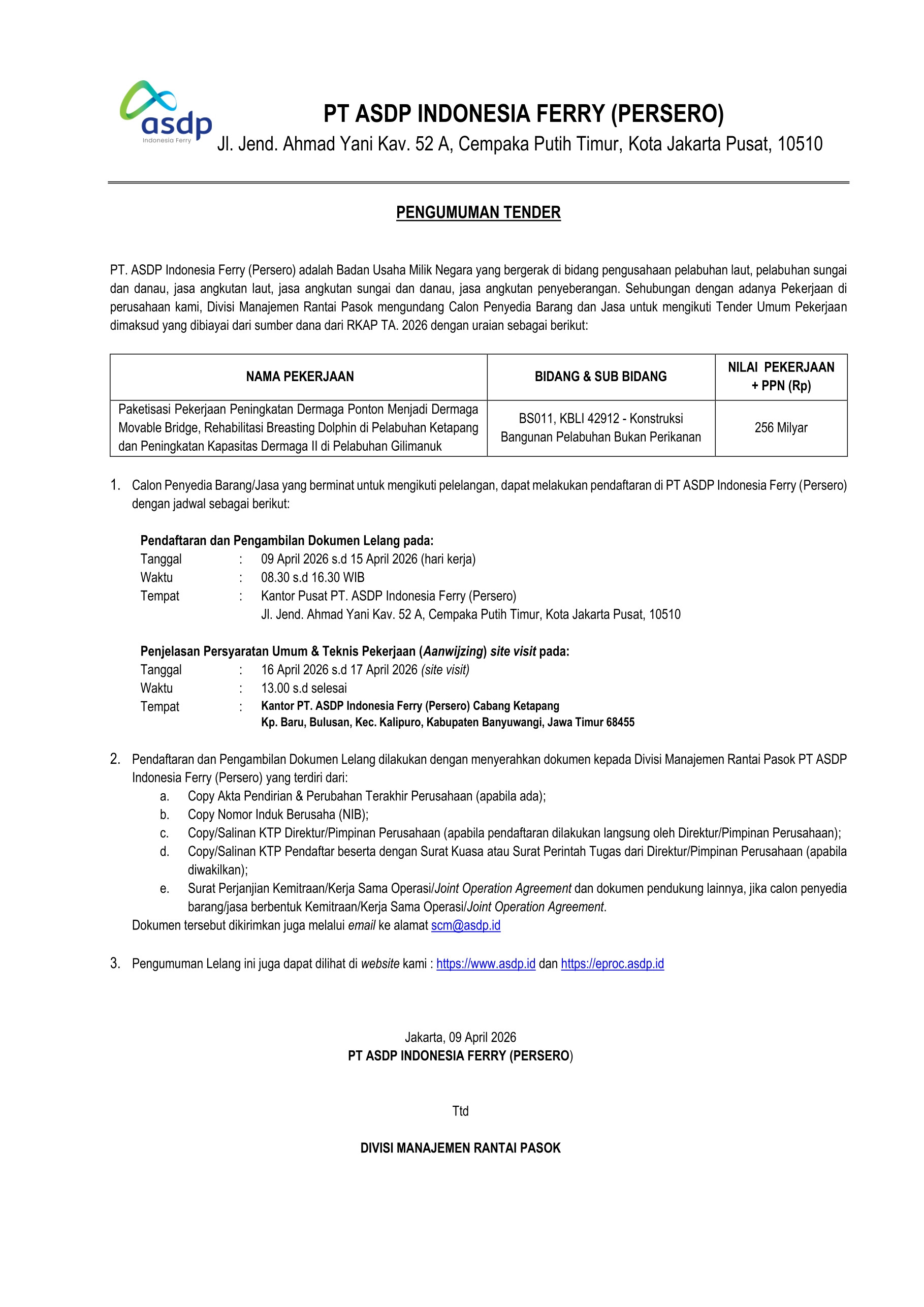 Paketisasi Pekerjaan Peningkatan Dermaga Ponton Menjadi Dermaga Movable Bridge, Rehabilitasi Breasting Dolphin di Pelabuhan Ketapang dan Peningkatan Kapasitas Dermaga II di Pelabuhan Gilimanuk