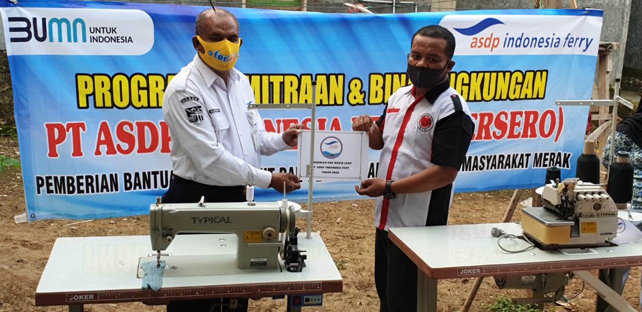 Jakarta, 11 Agustus 2020 --- PT ASDP Indonesia Ferry (Persero) melalui sub divisi Program Kemitraan dan Bina Lingkungan (PKBL) secara bertahap menyalurkan bantuan kepada kelompok UMKM penjahit yang berada di lingkungan Pelabuhan Merak, Banten.