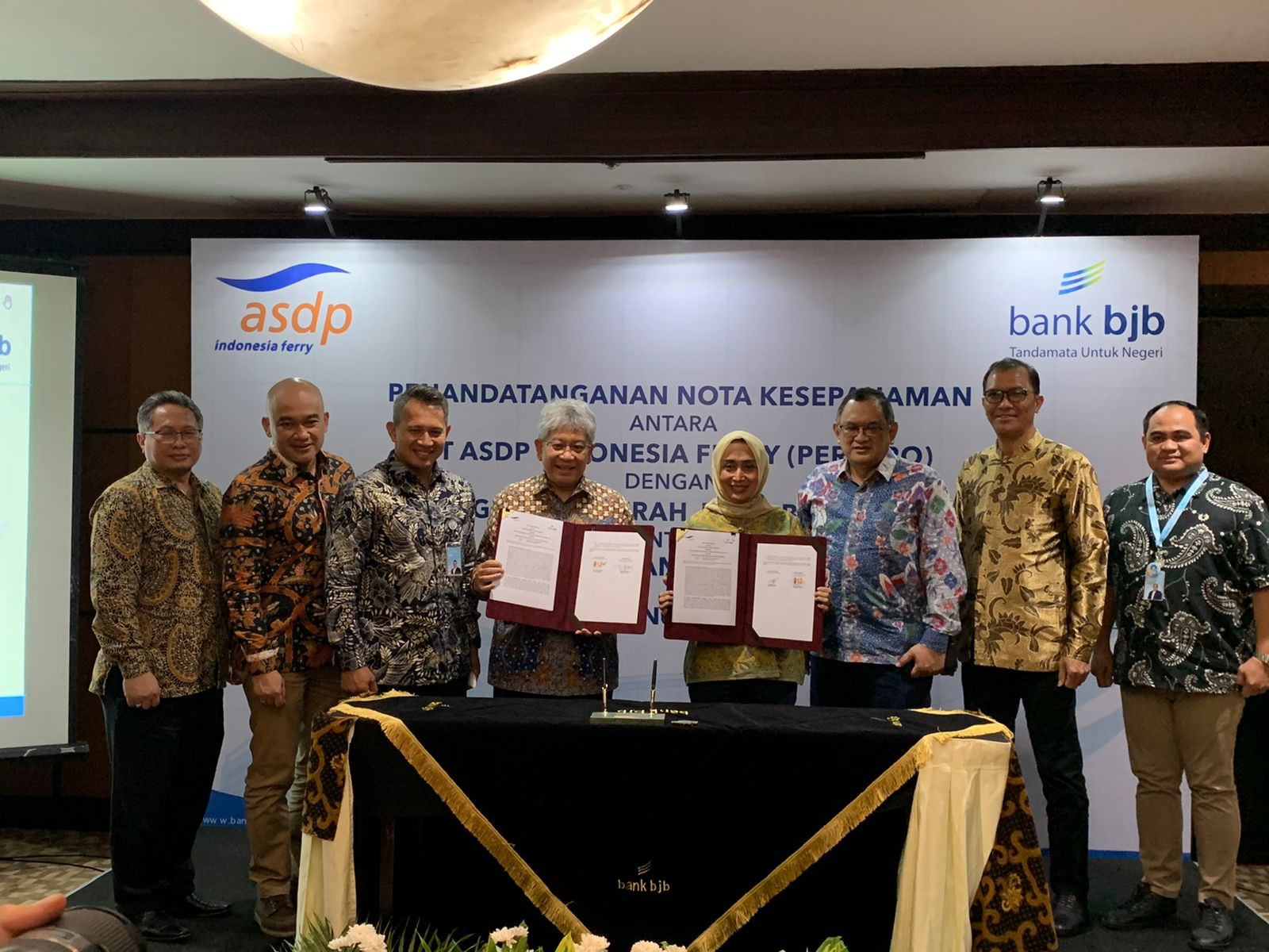 MoU diteken keduanya di Jakarta, Rabu (2/11) dimana pihak ASDP diwakili oleh Direktur Utama PT ASDP Indonesia Ferry (Persero) Ira Puspadewi dan Direktur Utama bank bjb Yuddy Renaldi. Turut hadir Direktur Komersial dan Pelayanan PT ASDP Indonesia Ferry (Persero) M. Yusuf Hadi dan Direktur Keuangan, Teknologi Informasi dan Manajemen Risiko PT ASDP Indonesia Ferry (Persero) Djunia Satriawan.