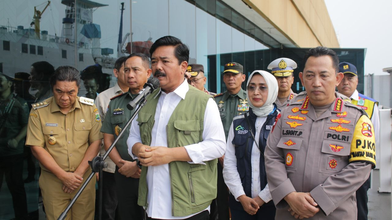 Merak, 1 April 2024 --- Menkopolhukam Hadi Tjahjanto bersama Kapolri Listyo Sigit Prabowo dan Panglima TNI Agus Subiyanto meninjau Pelabuhan Merak, Banten pada Senin (1/4) dalam rangka memastikan kesiapan dan menjamin pengamanan selama pelayanan libur Hari Raya Idul Fitri 1445 H di lintas penyeberangan tersibuk Merak-Bakauheni yang menghubungkan Pulau Jawa dan Sumatera.