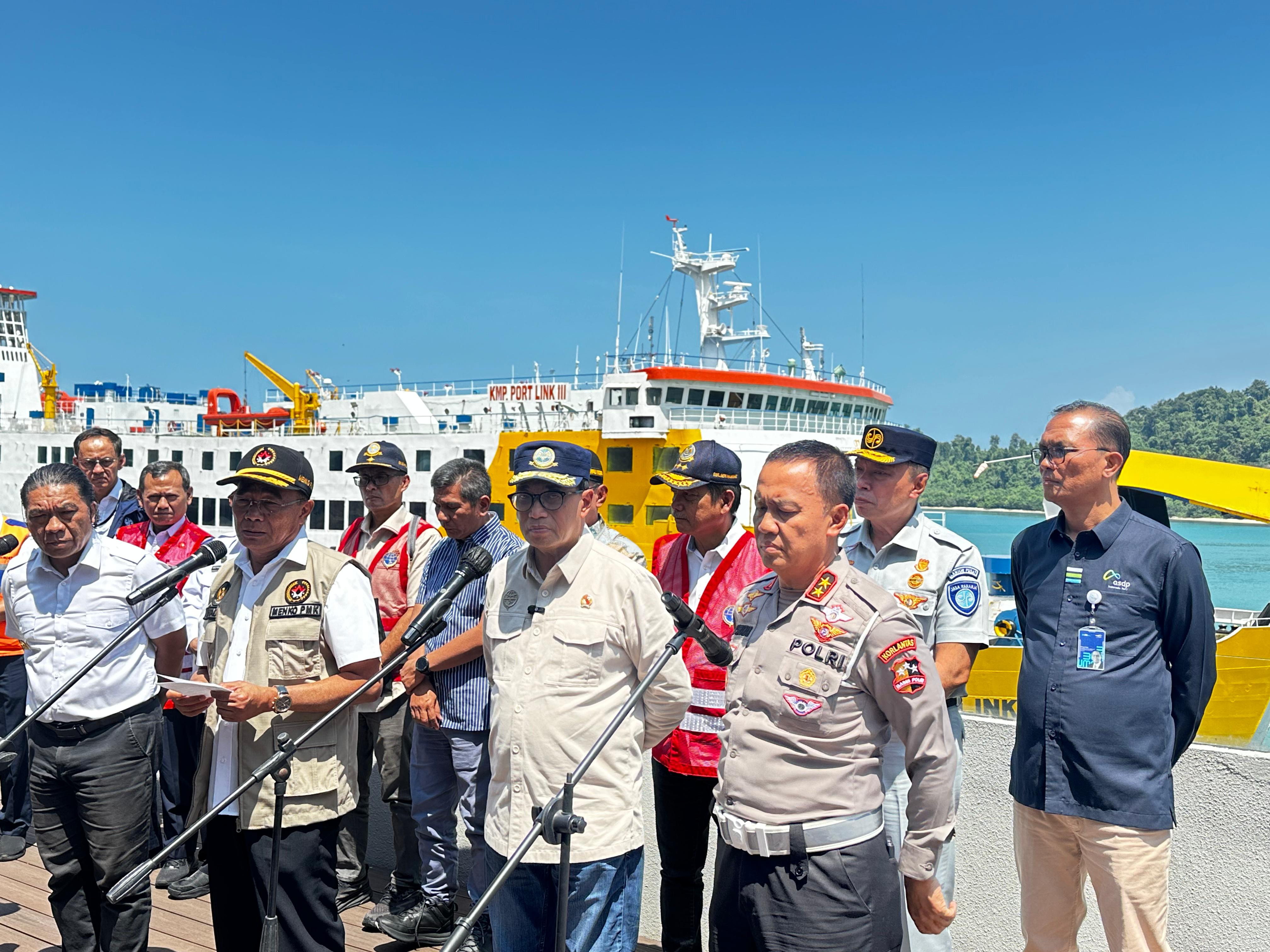 23 Maret 2024Merak, 23 Maret 2024 --- Dalam rangka memastikan kesiapan layanan penyeberangan menghadapi Angkutan Lebaran 2024, Menteri Perhubungan Budi Karya Sumadi bersama dengan Menko PMK Muhadjir Effendy kembali melakukan rapat koordinasi sekaligus kunjungan lapangan di Pelabuhan Merak, Banten, Sabtu (23/3) s...