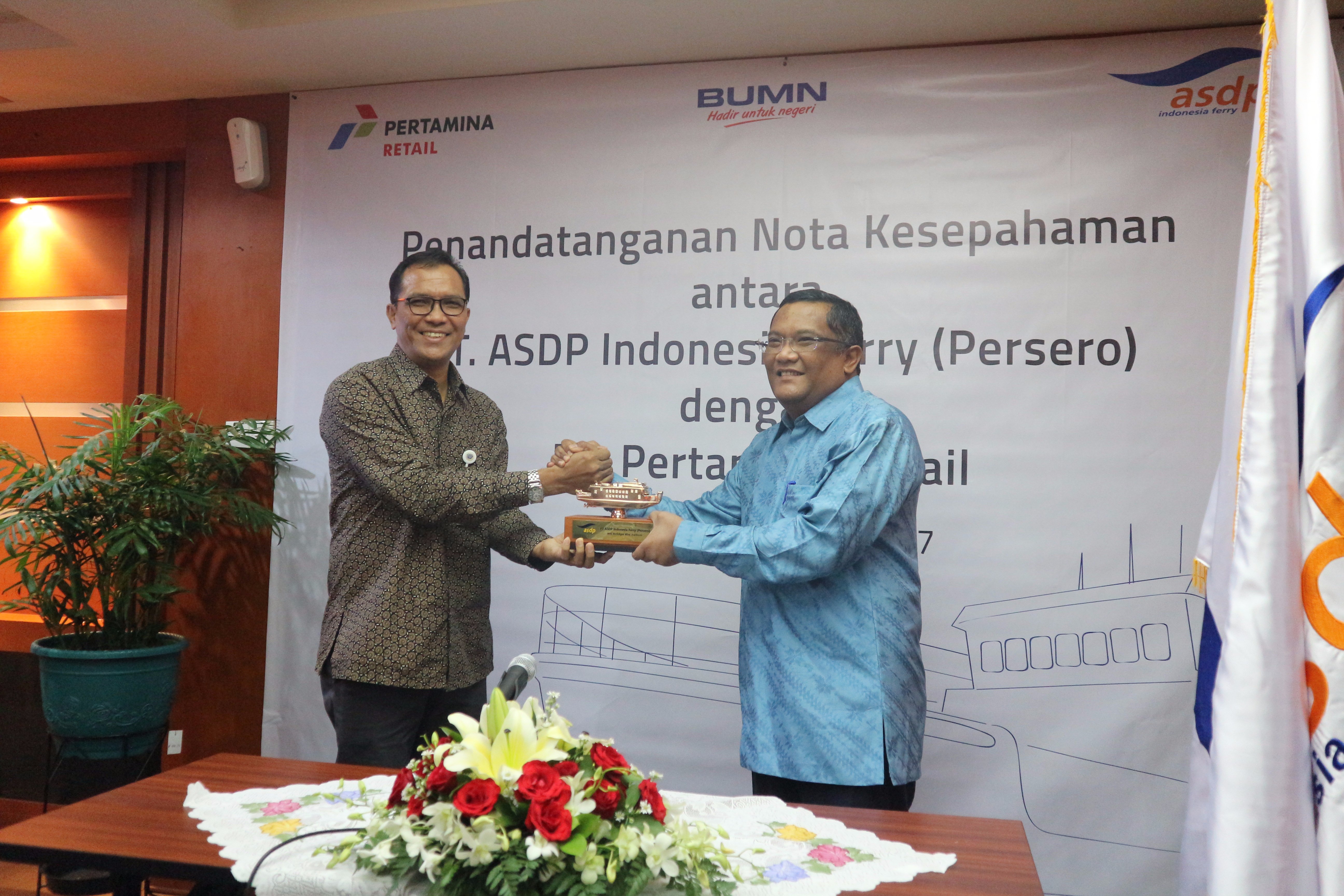 Kembangkan Potensi Bisnis, ASDP Gandeng Pertamina Retail 27 Oktober 2017 JAKARTA --- PT ASDP Indonesia Ferry (Persero) dan PT Pertamina Retail menandatangani “Nota Kesepahaman Korporasi” dalam rangka meningkatkan sinergi Badan Usaha Milik Negara (BUMN) melalui kerjasama pengembangan bisnis dan layanan kedua belah pihak, pada Jumat (27/10), di Kantor Pus...